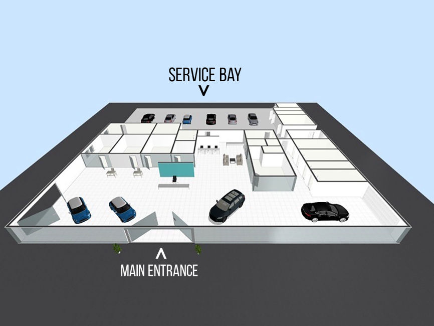 * a simplified floorplan indicating the Main Entrance and Service Bay